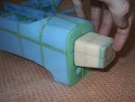 Se poate observa pe laterala botului si un patratel de placaj in care va intra surubelul de prindere a capotei. Sunt doua pe laterala (unu pe o parte unu pe cealalta) si unu jos, sub bot.